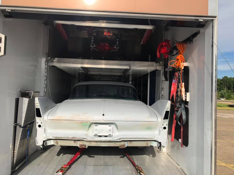 All of the trim was taken the car, some rust repairs performed around the back window, a lot of sanding and hitting with two dozen cans of primer. Then the car was taken to the paint shop and hit with 2 gallons of dark self-etching high-build primer and then a gallon of light of the same type of primer to somewhat act as a guide coat for sanding. Another couple days of wet sanding with 400 grit – and she was ready to go in the trailer for the trip to Indiana. I couldn’t get my big rig into the wrapper’s property, so we switched to a smaller trailer at my bud’s car dealership.